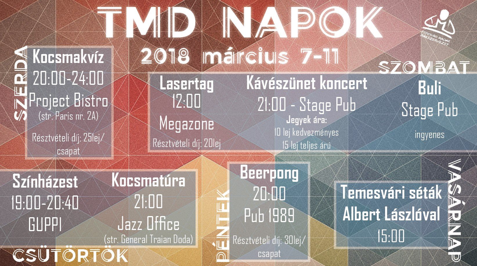 A TMD-nek vannak kisebb és nagyobb rendezvényei. Általában a kisebb rendezvények a szórakozásra és a közösségépítésre is koncentrálnak. A nagyobb rendezvényeink közé sorolnám feltétlenül a Műszaki Tudományos Diákköri Konferenciát, ami egy olyan színvonalas rendezvénye a szervezetnek, ami konkrétan a tudományos fejlődést hangsúlyozza. Az összes buli, kocsmakvíz, kocsmatúra és hasonló rendezvények között mégis csak ott van a mi TDK-nk, amit minden évben megszervezünk, hogy a temesvári értelmiségi életet is támogassuk. A közösségépítést és a szórakozást nem is lehet igazából elválasztani a TMD-n belül, mert a magyar közösséget Temesváron a szórakoztató rendezvények által hozzuk össze. És ez jó, mert egy bulin vagy egy kocsmatúrán olyan emberek találkoznak, akiknek talán máskor nincs idejük, vagy nincs lehetőségük rá, és nagyon jó az, hogy olyan emberek is megismerkedjenek egymással, akik eddig nem találkoztak még.