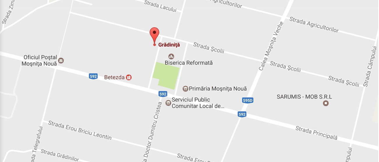 Az óvoda az újmosnicai református templom szomszédságában található a Piața Parcului és a Strada Școlii sarkán. A bejárat a Strada Școlii felől található. A Temesvárra haladó M22-es busz megállója a tér mellett található.