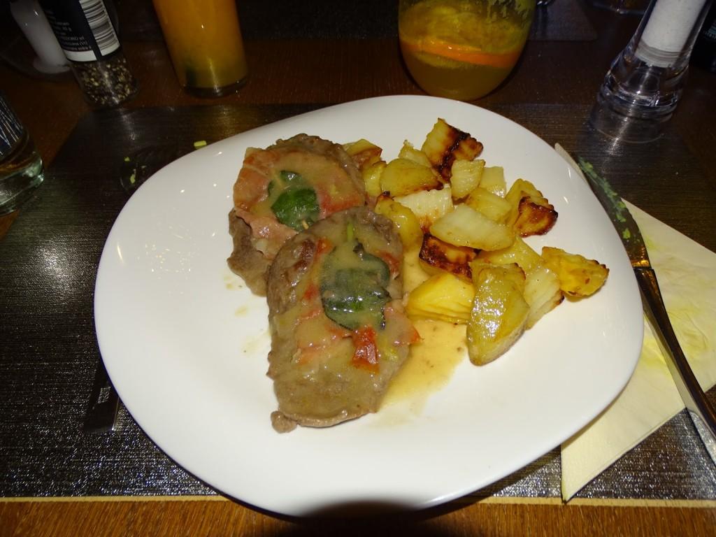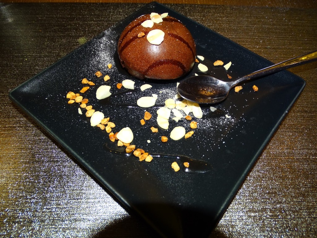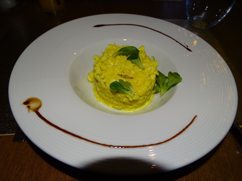 Délben a megszokottnál drágább és igényesebb menüt kínálnak 2000 forint körüli áron, kétfélét. Sajnos mire odaértünk az ördöghal már elfogott, így a másik menüt kértük, ami csirkés currys rizottó volt, burgonyával körített saltimbocca romana valamint egy dizájnos, csoki-félgömbbe rejtett tortadesszert.