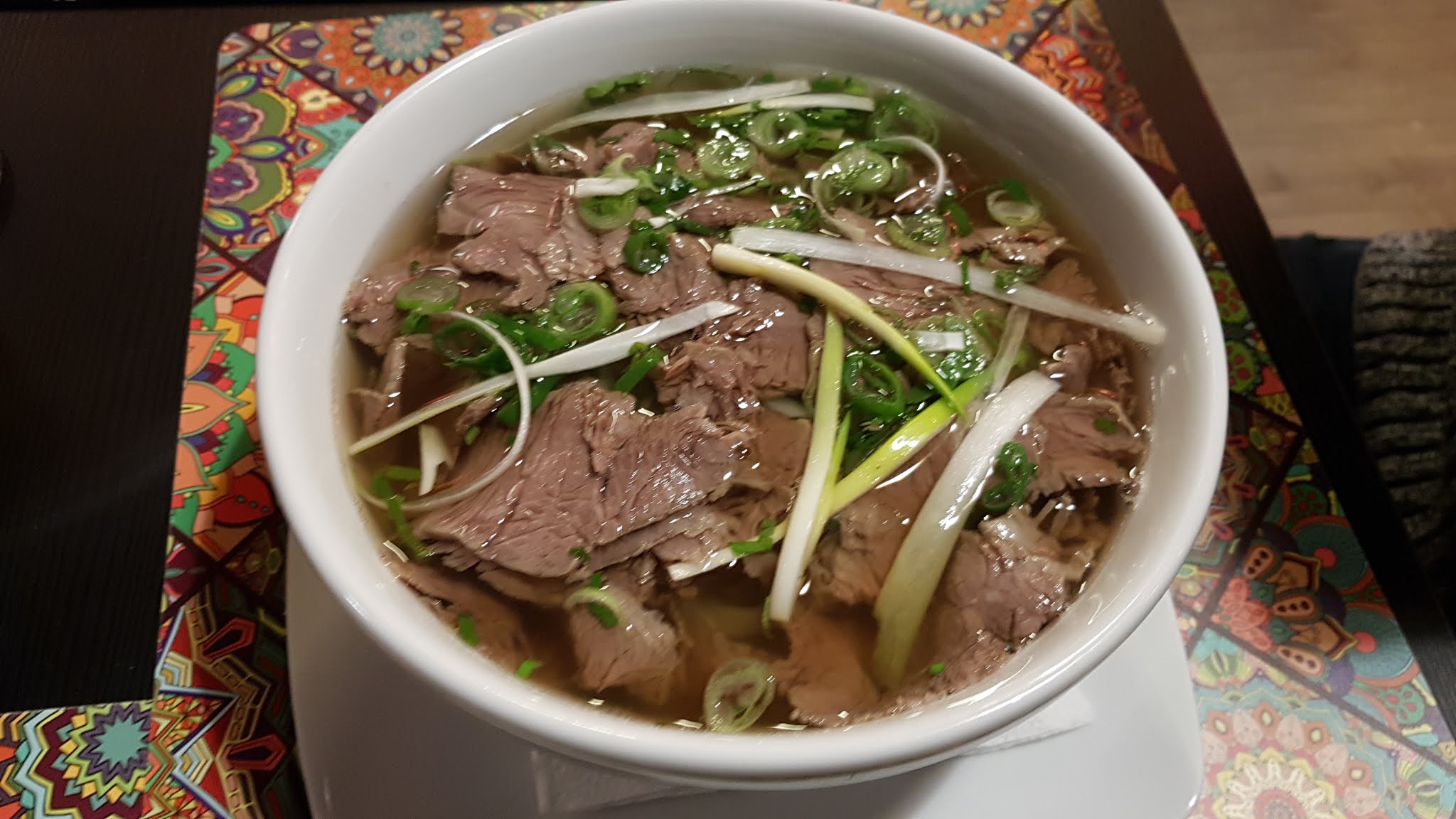 A marhahúsból készült pho-leves hozta a szokásos ízharmóniákat, azt a vibrációt, aminek köszönhetően ez az egytálétel népszerűvé vált az egész világon. Nem főtt túl a rizstészta és megfelelőan adagolták a zöld koriandert is.