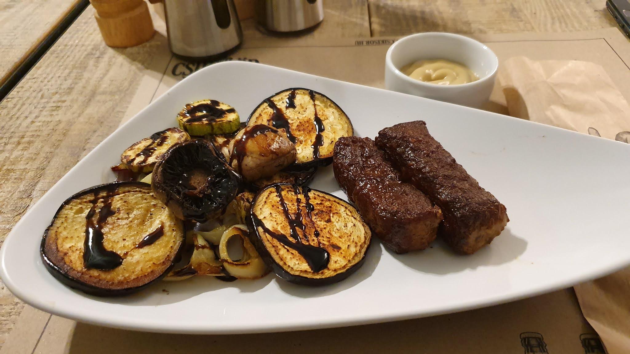 Tavalyi látogatásunk alkalmával a sör mellé miccset ettünk, mely nem sült sem parázson, sem bordázott vaslapon, de nem volt rossz, kívül tisztes pörzsanyag, belül szaftos hús. Kiváló, helyben sültnek tűnő kenyeret adtak hozzá. A roston sült zöldségek (padlizsán, cukkini, gomba) élvezhetőek, nem kiugróak. A csokiláva korrekt, jó ízű és jó állagú volt, a fagylalt gyengébb minőségű.