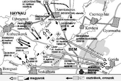 Bem arra számított, hogy főként a Nyárád-patak mentén kifejtendő lövegtűz által ellensúlyozni tudja majd az osztrákok és az oroszok esetleges támadásait. Kmethy György Szakálházánál és a beregszói erdőnél álló hadosztályának erélyes támadásokkal kellett volna zavarnia és feltartóztatnia az osztrákok előnyomuló jobboldalát, minél több ellenséges erőt vonva magára ezáltal. Bem 1849. augusztus 9-re a helyzetről nyert hézagos és megbízhatatlan tájékozódás alapján – Haynauhoz hasonlóan – nem várt komoly csatát. Kmethy György figyelemelterelő hadmozdulatainak és a tüzérség intenzív tevékenységének leple alatt, este felé a fősereggel Aradra szándékozott átvonulni, hogy ott Görgei hadával egyesüljön. A hadszíntéren hasznavehetetlen, lőfegyverekkel jobbára el nem látott újonc-zászlóaljakat Józef Bem már a délelőtti órákban el is indította Arad irányába. A „kaszás népet” azonban visszafordította az Orczyfalvánál Medvey lovas százados parancsnoksága alatt portyázó császári csapat által megtámadott honvédkülönítmény, amelyből 280 embert foglyul ejtettek az osztrákok, akik 4 ágyút, 260 társzekeret és 82 lovat is hatalmukba kerítettek. A legénység megmenekült része Arad illetve Temesvár irányába tartott.