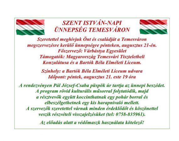 Szent István-napi ünnepség augusztus 21-én 19 órától a Bartók Líceum udvarán