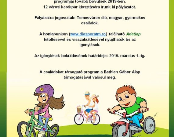 A temesvári Szórvány Alapítvány családközpontú programjai tovább bővülnek 2019-ben. A programsorozat első lépéseként 12 városi kerékpár kiosztására írunk ki pályázatot....