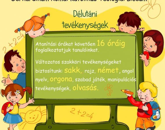 A temesvári Gerhardinum Római Katolikus Líceum ajánlata kisiskolásoknak Alsó tagozaton a tanítási órákat követően 16 óráig foglalkoztatjuk tanulóinkat napközis csoportokban,...