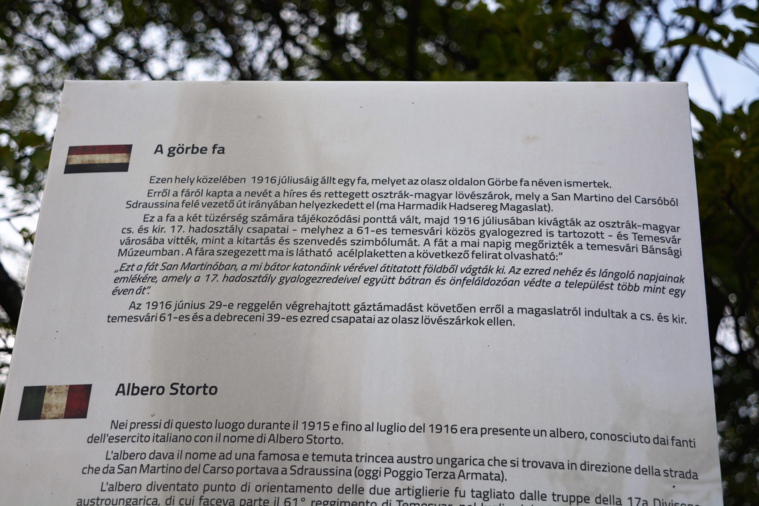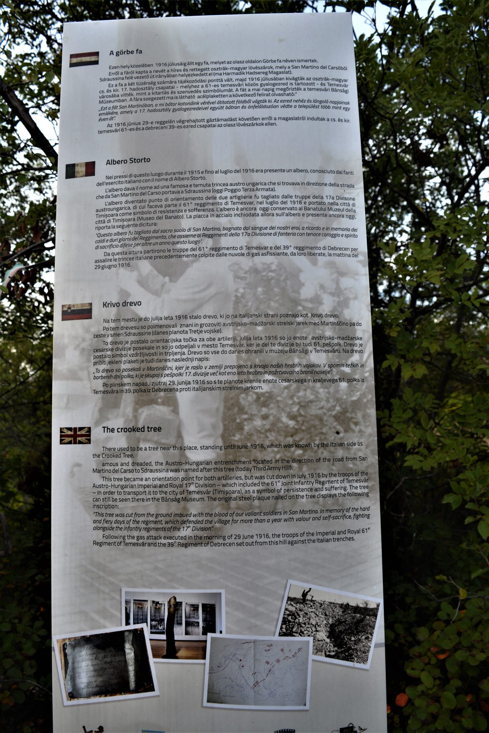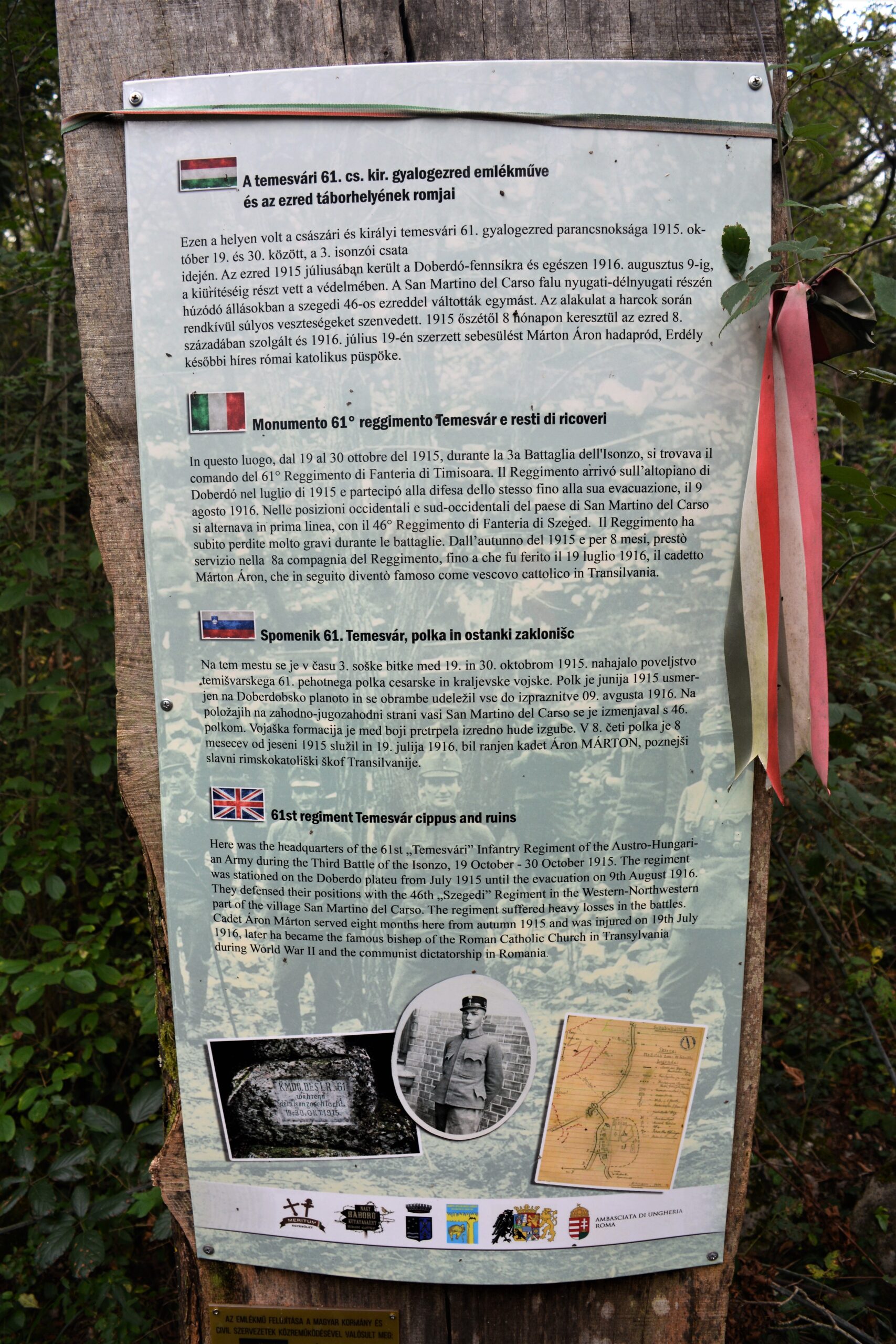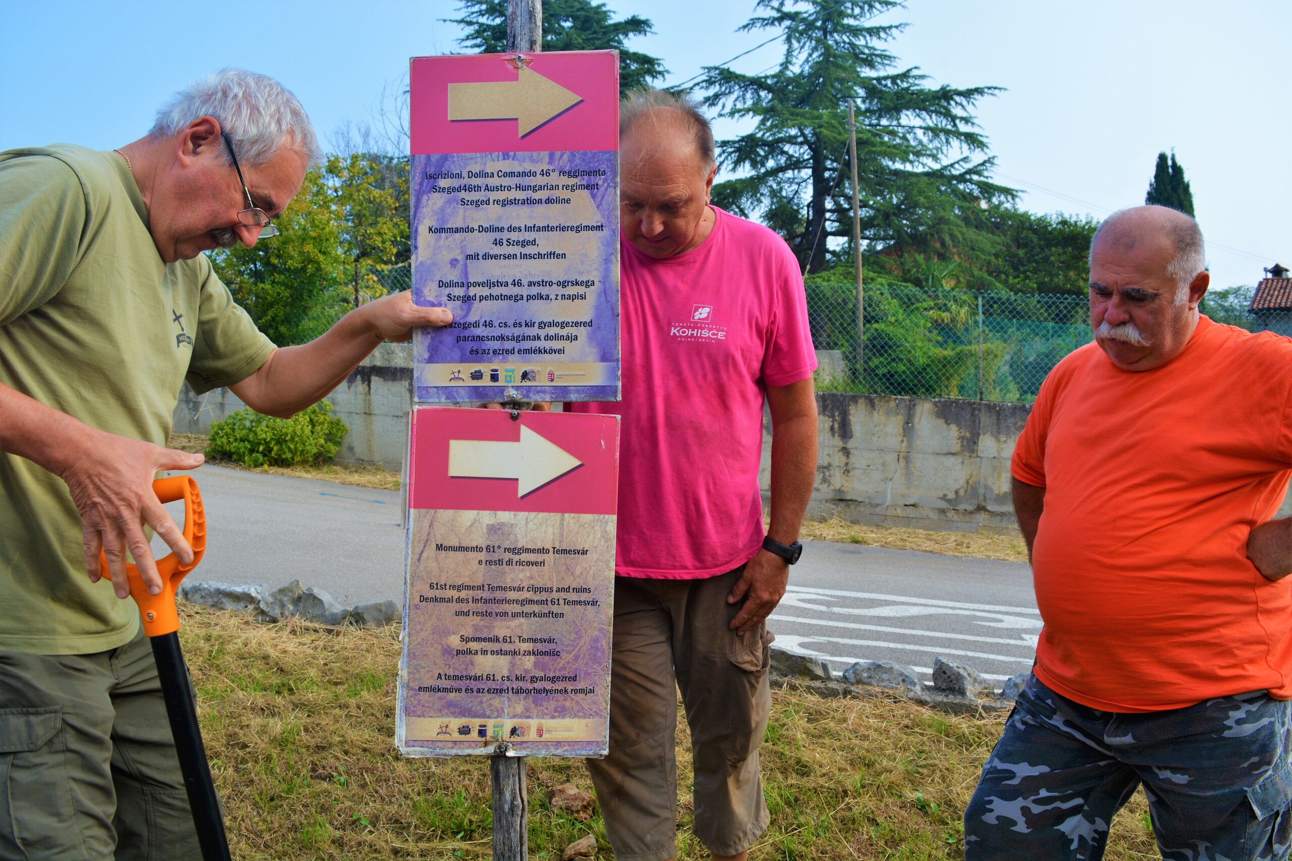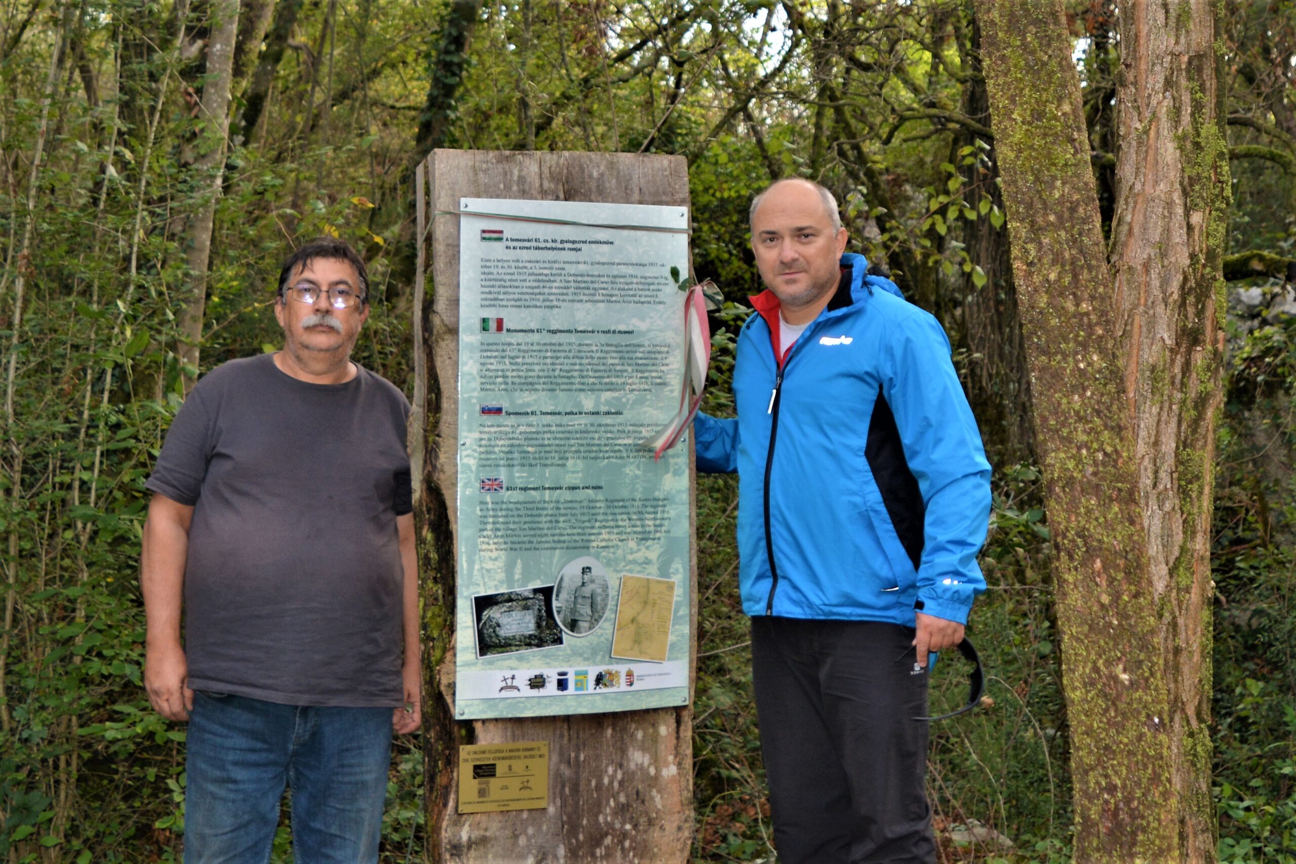 Murányi Gábor: Most útbaigazító és információs táblák újultak meg. A 2013-ban elhelyezett tábláink, amelyek éppen a szegedi, valamint a temesvári parancsnokság helyét mutatják, jelentősen kifakultak és a tartószerkezet is tönkrement. Most egy sokkal szebb és jobb tábla várja a Doberdóra látogatókat és mutatja az utat az erdőbe, az egykori történelmi helyszínekre. A tábla igazi csapatmunka volt, olaszok, szegediek és temesváriak közös ténykedése.