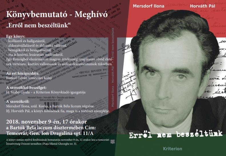 Egy könyv kiállásról és hallgatásról, áldozatvállalásról és áldozattá válásról, besúgókról és besúgottakról – ma is kísértő, lezáratlan múltunkról. Egy Bánságból elszármazott magyar értelmiségi tragikusan rövid életének története, kortárs vallomások és szekus dokumentumok tükrében.