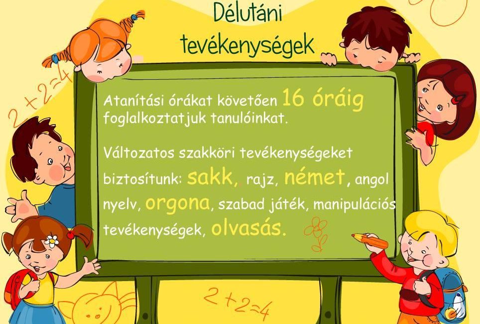 Emellett rendkívül színes, változatos szakköri tevékenységeket biztosítunk diákjainknak : sakk, rajz, német, angol nyelv, orgona, szabad játék, manipulációs tevékenységek, olvasás.