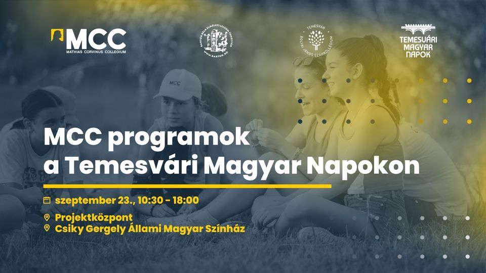 👉 A Mathias Corvinus Collegium – Erdély (MCC) a Bartók Béla Elméleti Líceummal és a Bolyai János Szakkollégium Temesvárral együttműködve szórakoztató programokkal várja a gyerekeket és fiatalokat, valamint izgalmas előadásokkal a felnőtteket a Temesvári Magyar Napokon, Európa kulturális fővárosában.